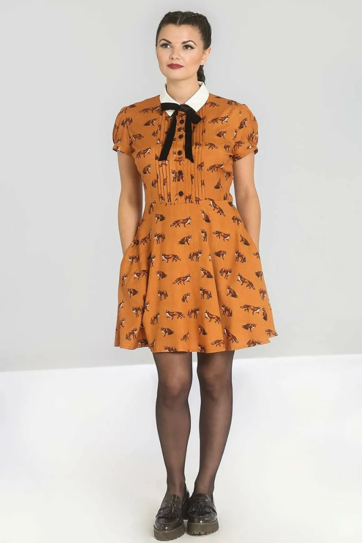 Printed Viscose Dress With Black Velvet Bow And Ivory CollarPrint Is Of Foxes On A Brown BackgroundDecorative Placket On…