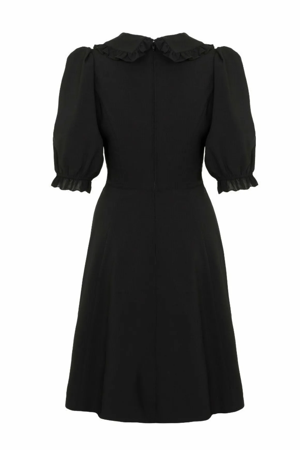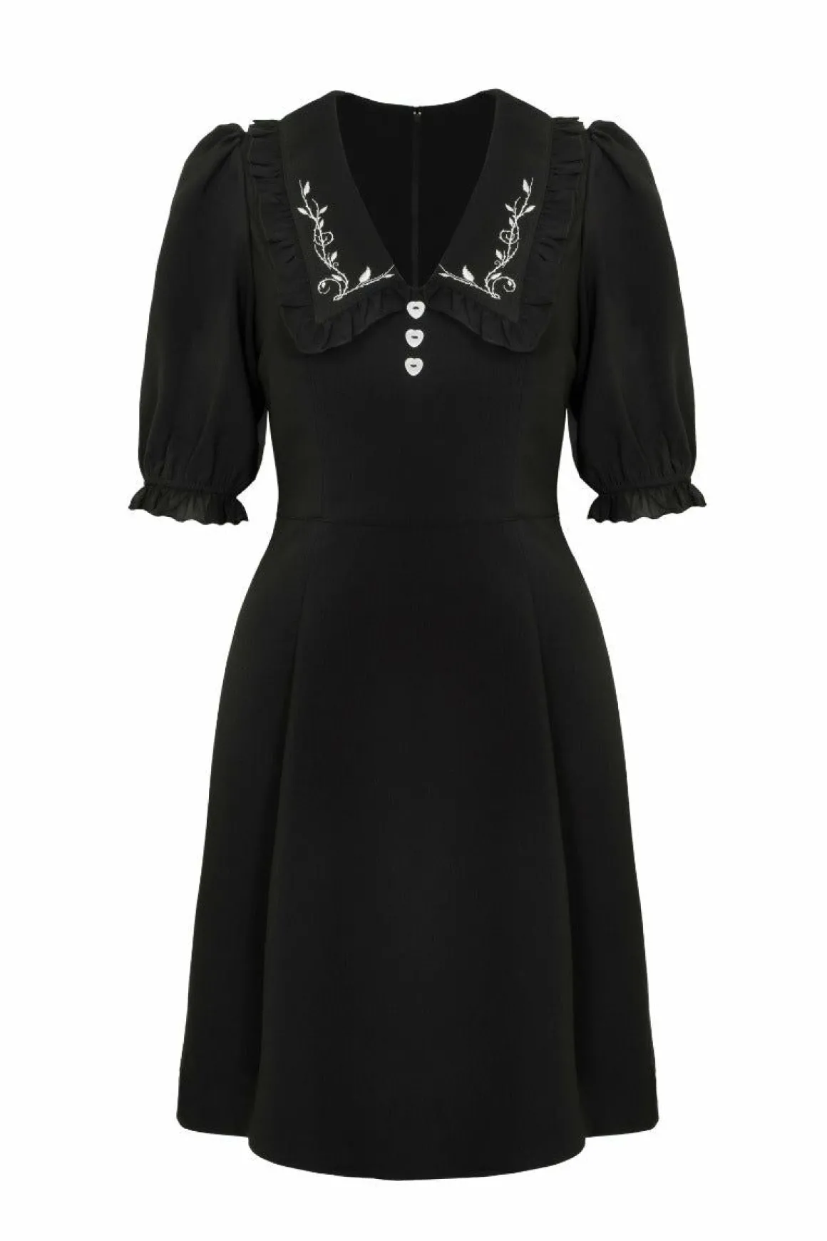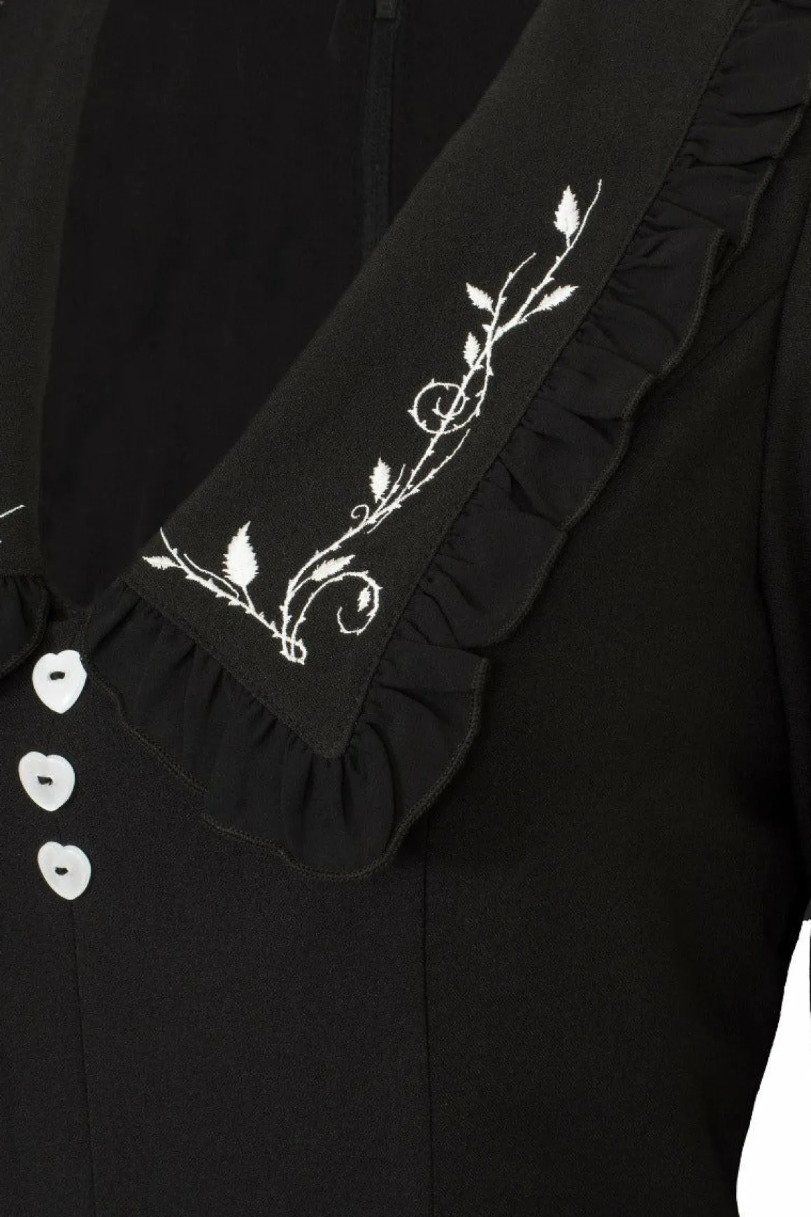 Black Stretch Knee DressV Neckline ChestlinePointed Collar With Black Frill EdgingWhite Ivy Emroidery On CollarContrasti…